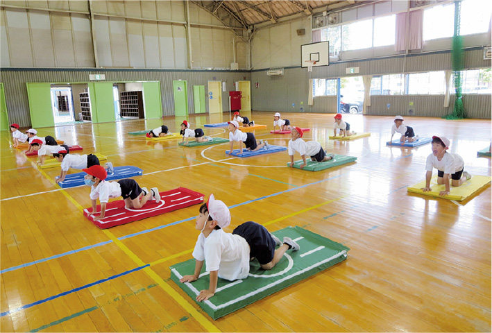 子どもたちが生涯にわたり困らないからだづくりとして、体育の授業の中に体幹を鍛える二つの運動を継続的に取り入れている。姿勢保持に役立ち体幹を鍛える「ねこちゃん体操」と筑波体育授業研究会提唱の「折り返し走」により、運動に必要な基礎感覚を身に付け、運動好きな子どもたちの育成を図っている。